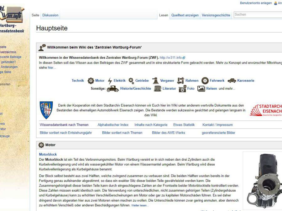 Das Wartburg Wiki, eines der genialsten Gemeinschaftsprojekte vor einigen Jahren. Hier findet ihr Unmengen an Wissenswerten Details zum Wartburg. Fleissige haben freiwillig unglaubliche Mengen an Fotos und Wissen in diesem Wikipedia für den Wartburg zusammengetragen. Oft hilft ein Blick auf diese Seite und ist auch für uns regelmäßig ein schneller Helfer.